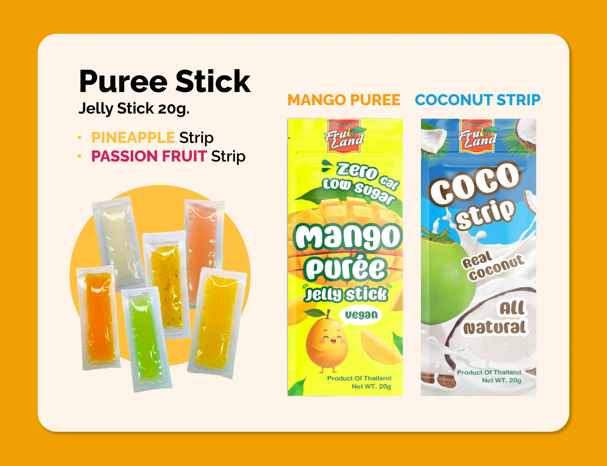 Indulge in the juicy, refreshing taste of Thailand with Fruit Puree, a jelly snack crafted from the real fruits and natural ingredients. Each bite bursts with the lush, fresh flavors of just-picked fruits, delivering a pure, authentic fruit experience. Naturally free from artificial flavors or additives, this snack offers a deliciously guilt-free way to enjoy the succulent and vibrant taste of fruit anytime.