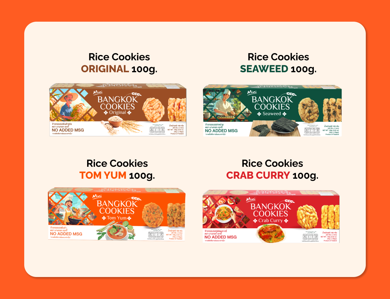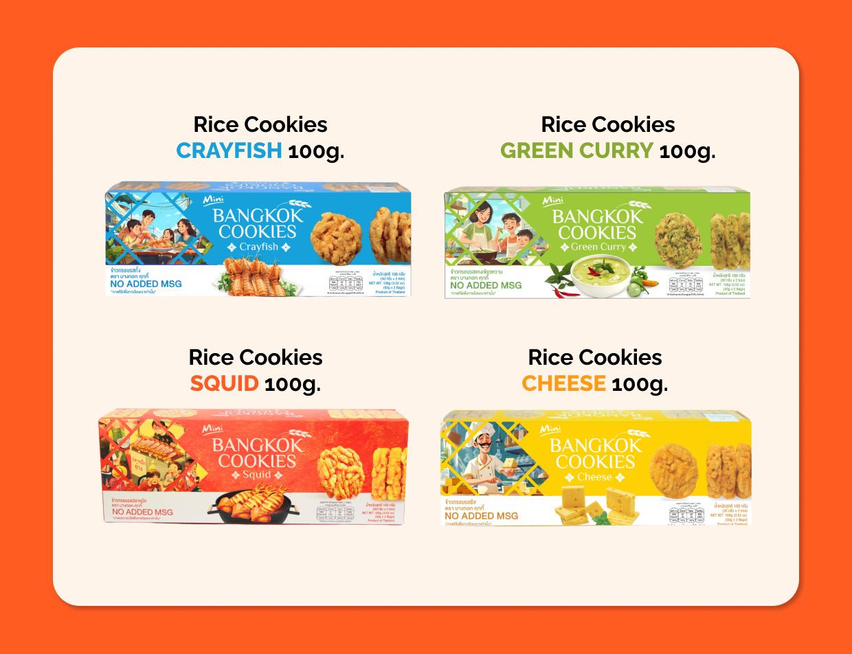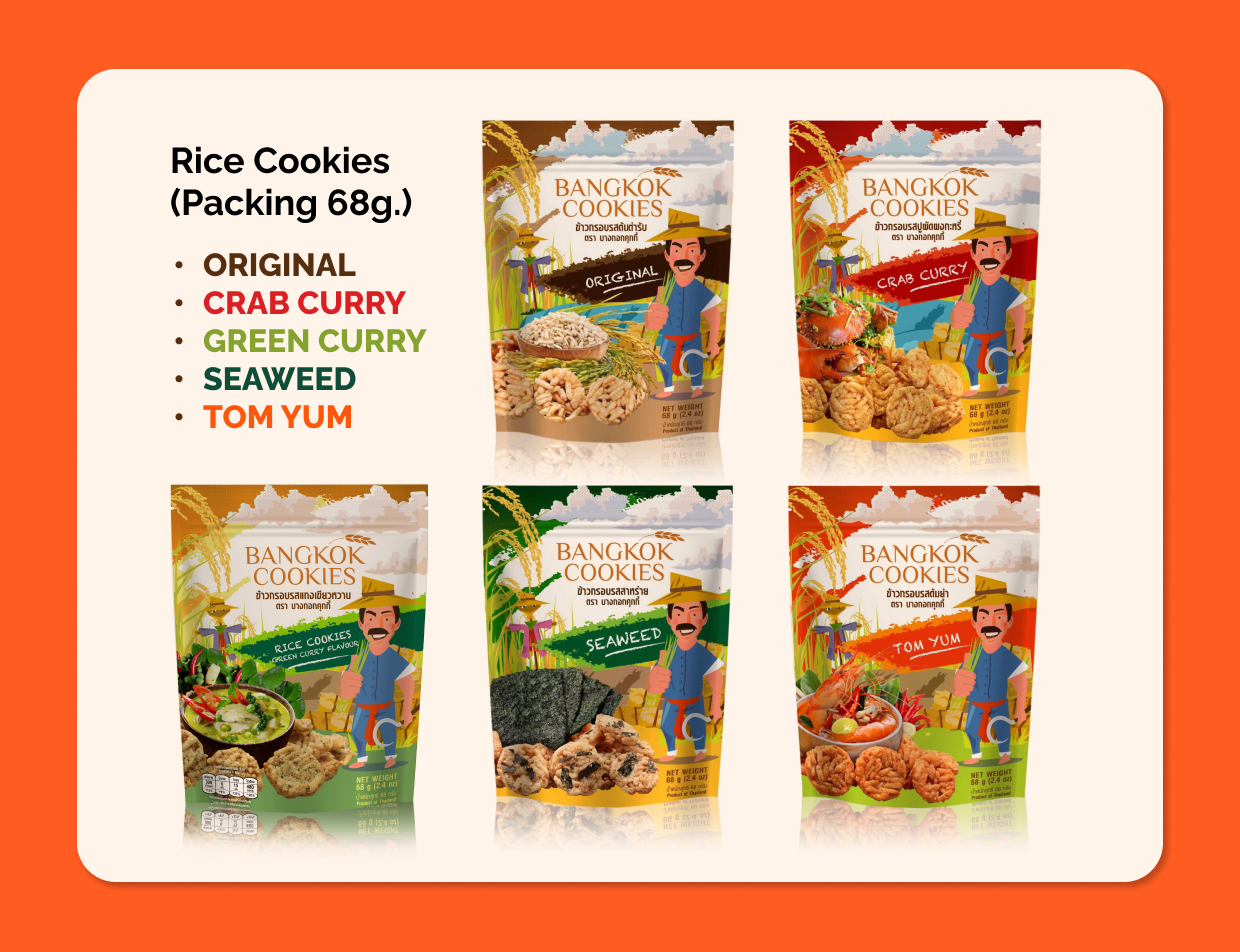 Rice cookies packed with deliciousness and creativity! Using tradition with innovation to create modern Thai flavors, enjoy the tangy taste of sour cream, the spicy zing of tom yum, the bold flavor of larb, the rich notes of green curry, the savory goodness of curry crab, the crispy seaweed, and the sweet aroma of coconut sugar.
