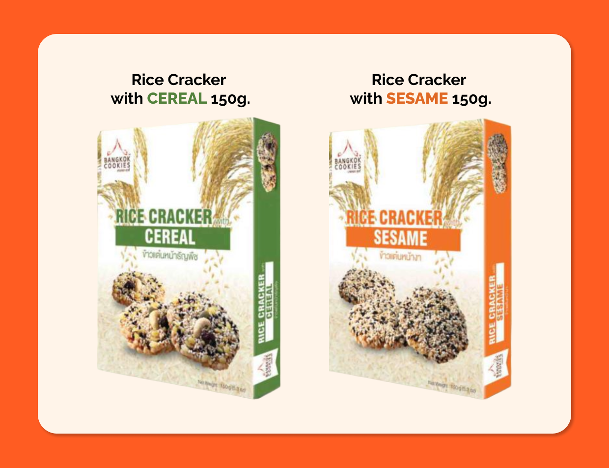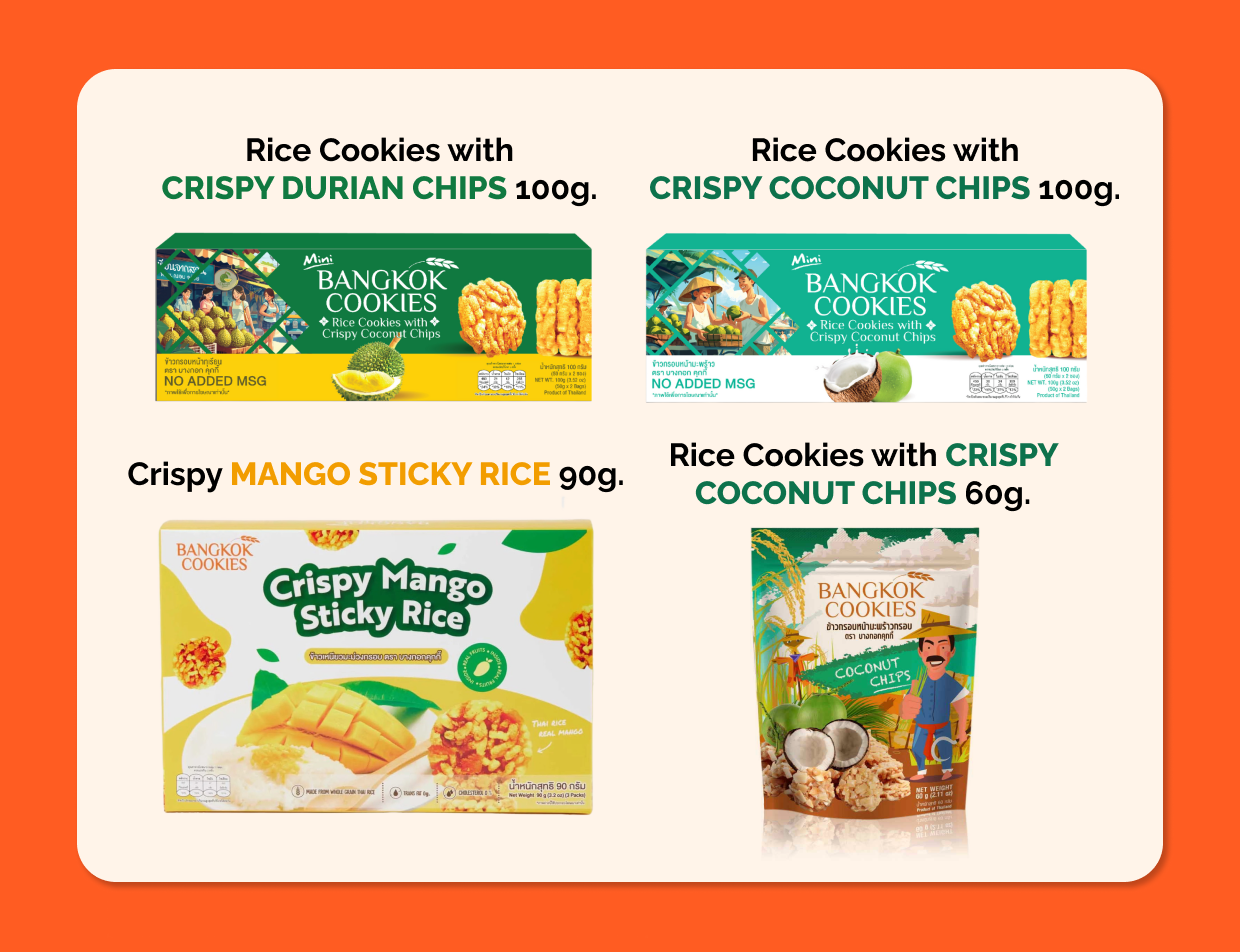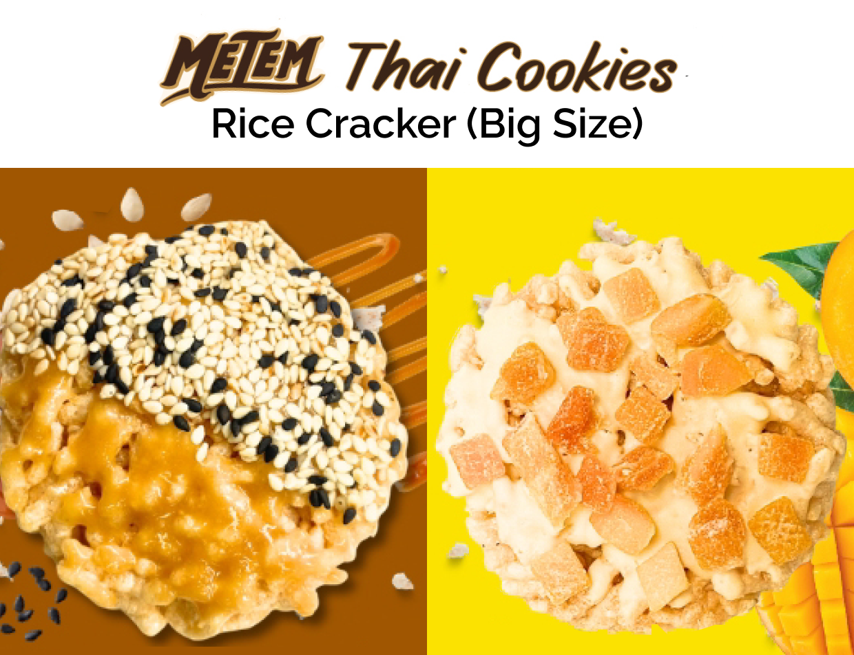 Rice cookies packed with deliciousness and creativity! Using tradition with innovation to create modern Thai flavors, enjoy the tangy taste of sour cream, the spicy zing of tom yum, the bold flavor of larb, the rich notes of green curry, the savory goodness of curry crab, the crispy seaweed, and the sweet aroma of coconut sugar.