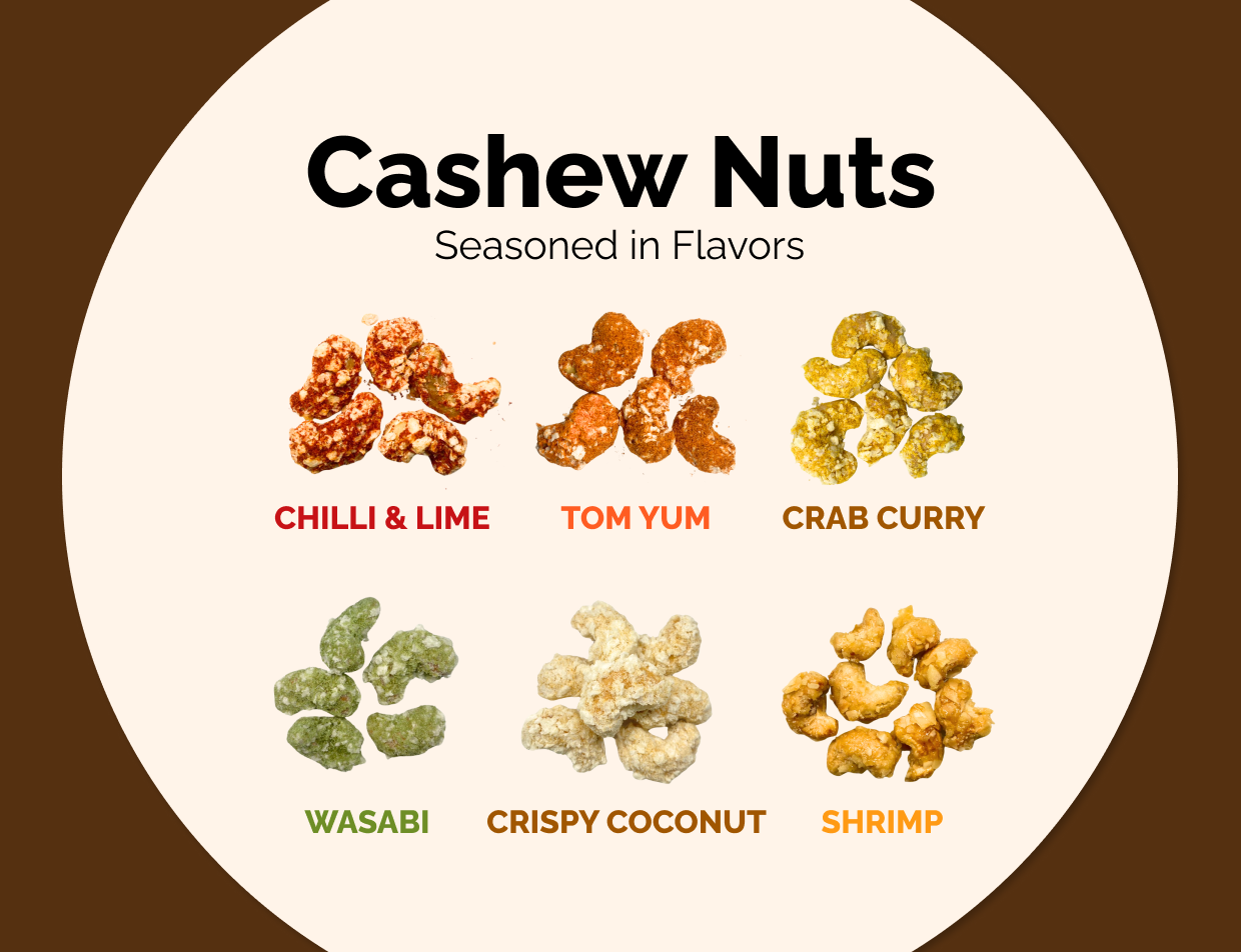 Enjoy the bold flavors of Thailand with cashew nuts from Flavored Cashew Nuts. Seasoned with a perfect mix of Thai spices, these cashews offer a delightful mix of sweet, sour, spicy, and salty tastes. Rich in protein and healthy fats, they're an ideal snack for health-conscious food lovers.